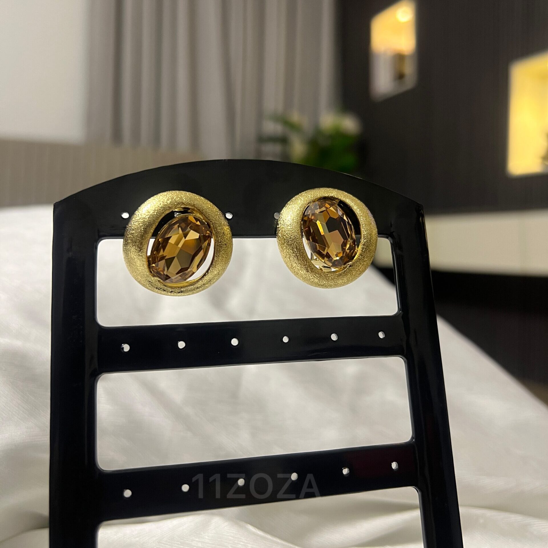 Gold round studs with amber crystal center. Warm glow. Classic authority.